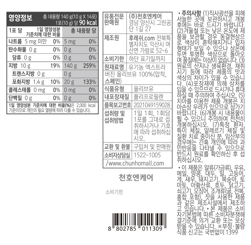 [단종] 천호엔케어 퓨어 유기농 엑스트라버진 올리브오일 10g*14포*2상자
