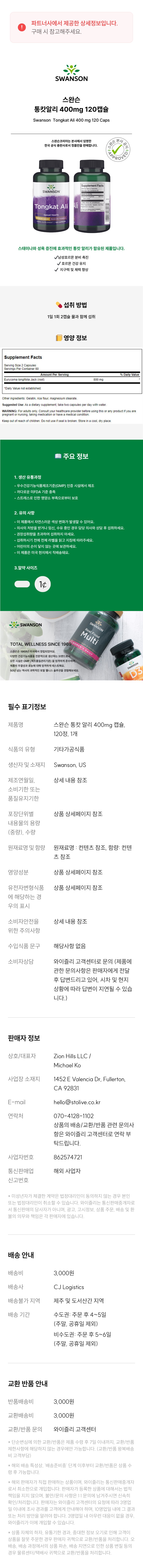 스완슨 통캇 알리 400mg 캡슐, 120정, 2개월 분, 1개