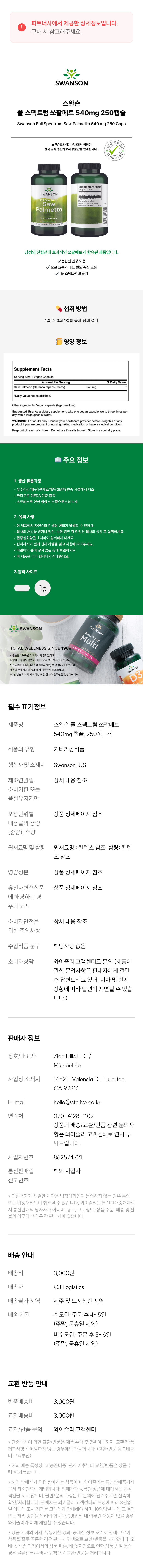 스완슨 풀 스펙트럼 쏘팔메토 540mg 캡슐, 250정, 1개