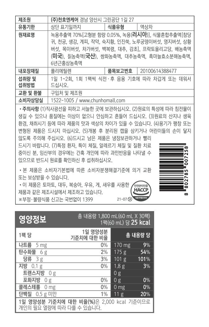 [한정수량] 천호엔케어 천맥녹용 더블랙 60ml*30팩*1상자