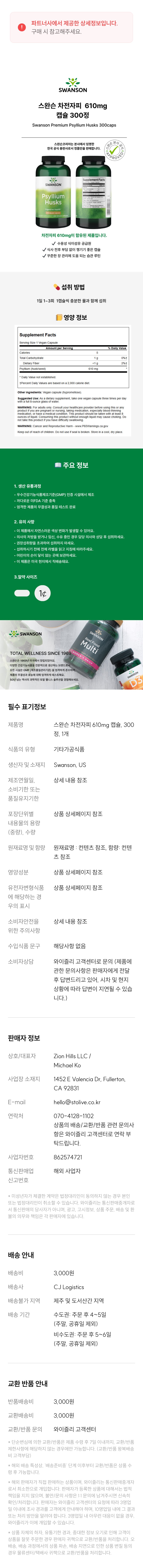 스완슨 차전자피 610mg 캡슐, 300정, 1개