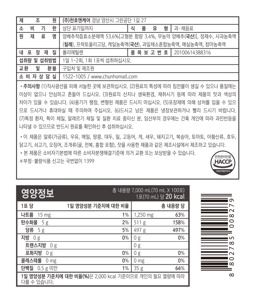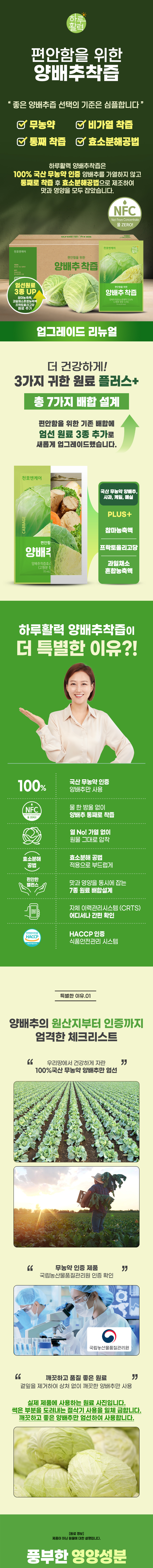 [한정수량] 천호엔케어 하루활력 양배추팩 70ml*100팩(4S)*1상자
