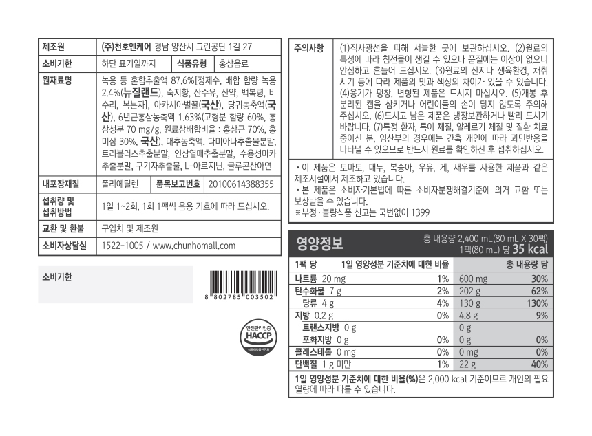[한정수량] 천호엔케어 천심본 황제녹용홍삼 80ml*30팩*1상자