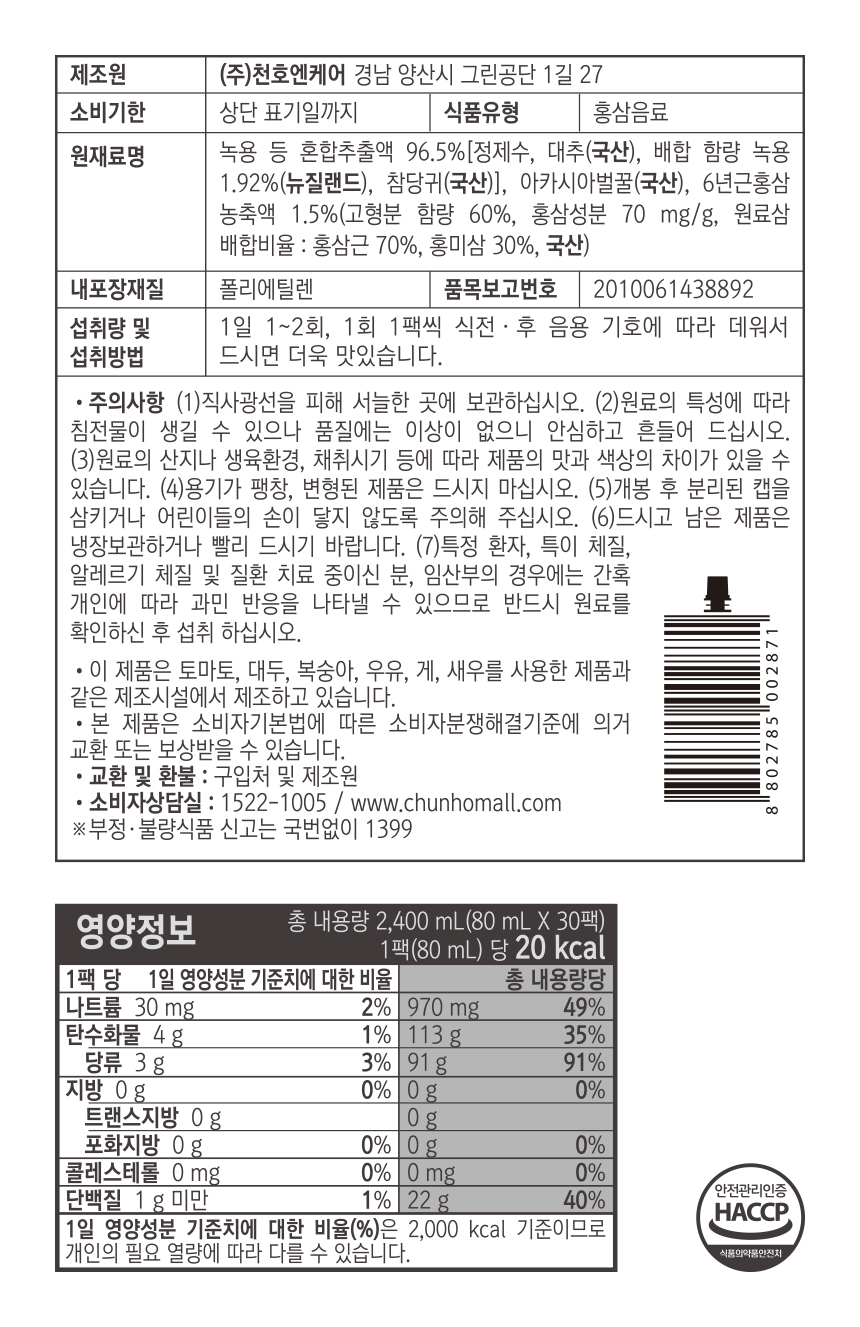 [한정수량] 천호엔케어 천심본 녹용홍삼 80ml*30팩*1상자