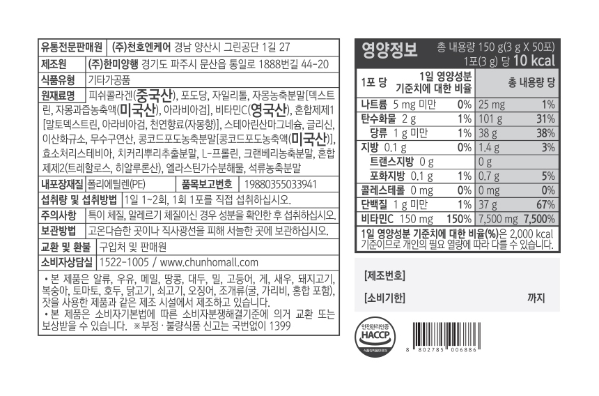 [한정수량] 천호엔케어 데일리코어 초저분자콜라겐비타민C 3g*50포*3상자