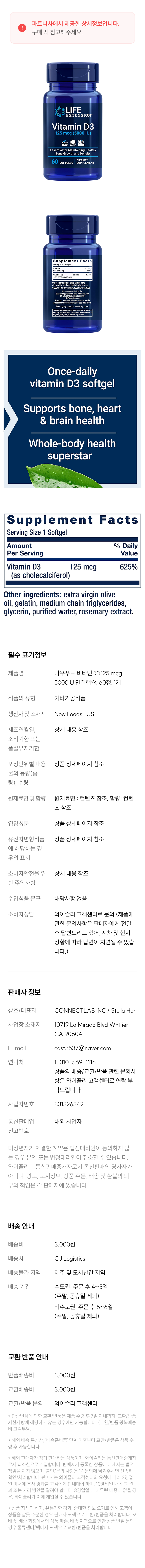 라이프 익스텐션 비타민 D3 5000IU, 연질캡슐, 60정, 1개