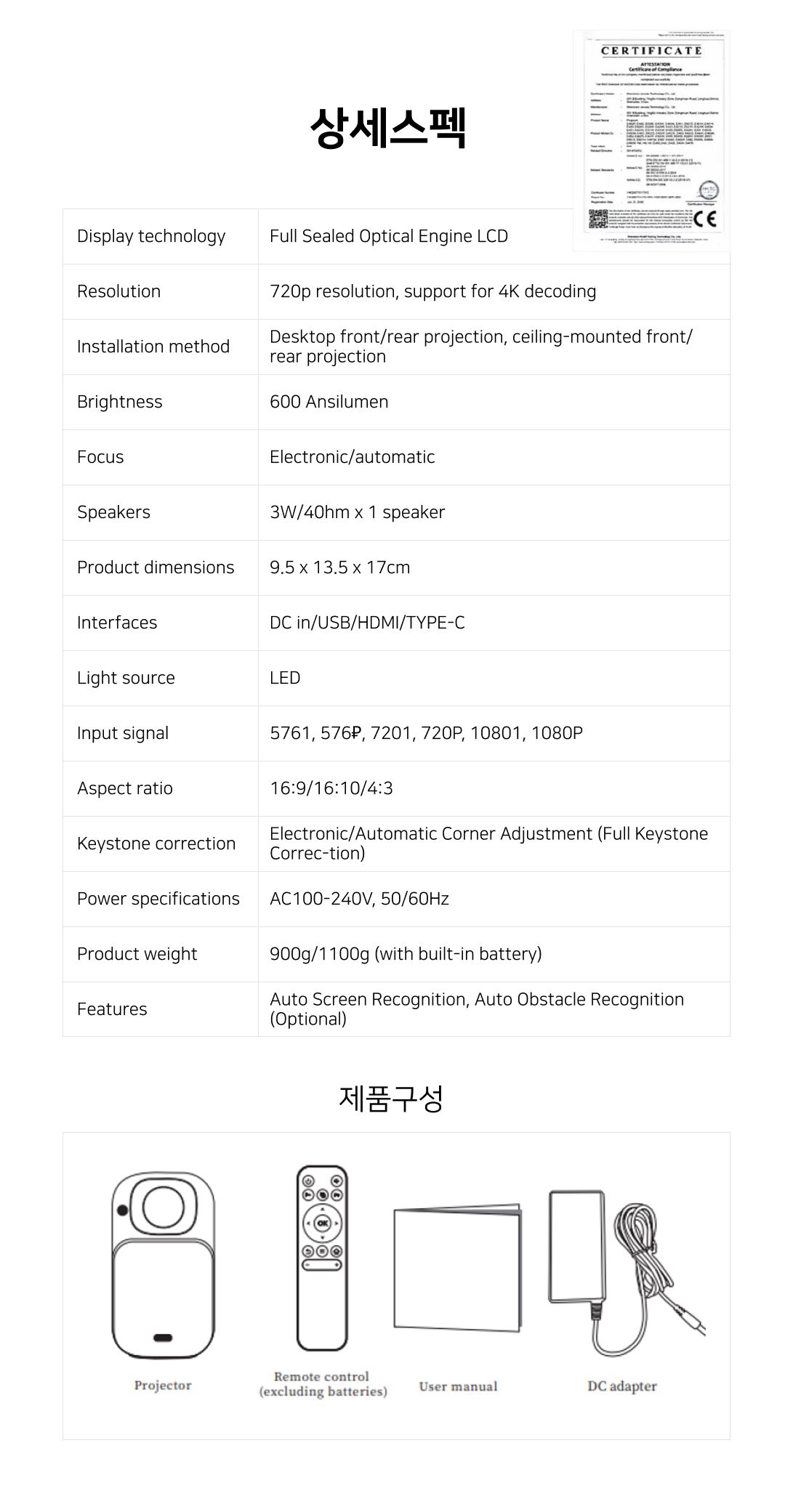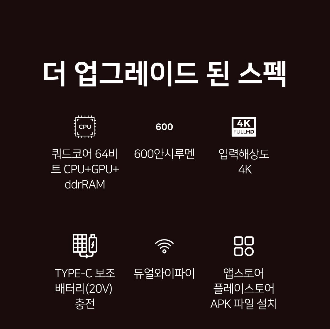 - 화질: 고명암비 8,000:1, 직사각형 반듯한 화면조정 디지털 코너키스톤, 완전 자동 포커스/스크리닝/키스톤 기능
